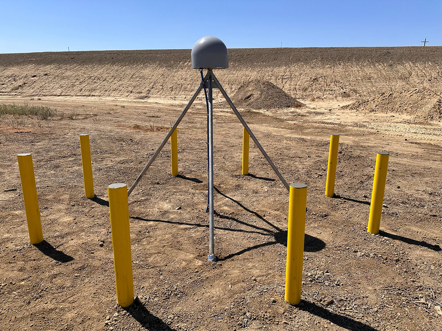 The vertex of the legs typically stands 5-6 feet in height with the SCIGN antenna mount threaded, then welded, atop the intersection. The angled, bracing legs with ~650 lbs of steel and ~3,000 lbs of grout give the monument stability. Together with the vertical center leg, the monument has 5 axes of resistance to non-tectonic motion and is braced/grouted into strata or rock from 15-35 feet in depth for each leg. Compare this with a pillar or post monument that generally extends 4-10 feet into the subsurface, has only 1 axis for stability, and has no decoupling materials.